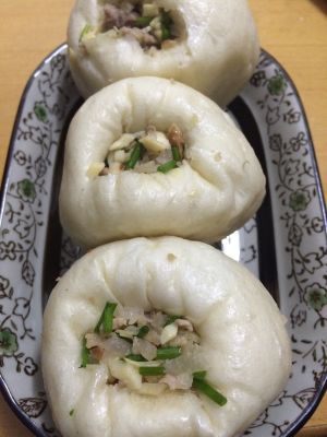 把买来的龙游特色馒头上锅隔水蒸软取出,在馒头边用小铁勺戳个小口,大母指把馅塞进馒头里,要吃就上锅蒸热就
