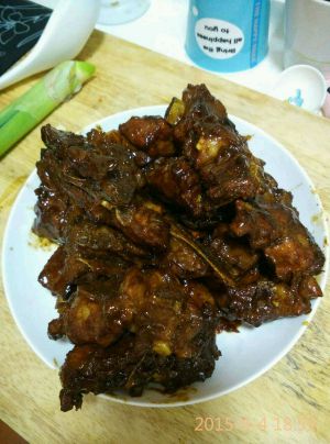 先放生姜,桂皮,八角,料酒,蒜头,酱油,来回翻炒后倒入开水抹过排骨,小火焖40分钟左右,最后加少许盐,收汁起锅,