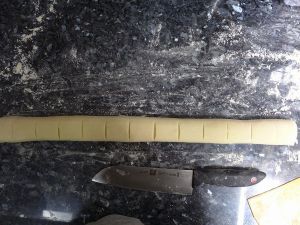 然后切出花边,如图。再取一块面,擀成椭圆形,切出几个细长条备用。