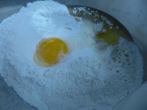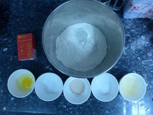 先把称量好面粉、糖、盐、等干性材料拌匀。然后加入鸡蛋。油。水或纯牛奶
