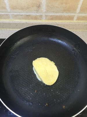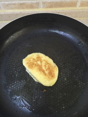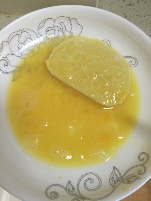 把蘸有鸡蛋的馒头片放入开小火放适量油的平底锅里,慢慢煎,变色翻另一片煎