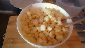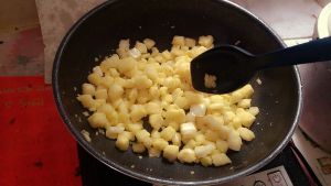 馒头切丁,鸡蛋打碎 两者均匀合体。