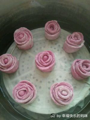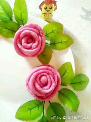 将发酵好的面团先排气再揉成团,再分成多个相等的小剂子搓圆,用五个小剂子擀成薄片一个小挤子搓成小圆柱子并排在一起,然后卷起来对半切就是两朵玫瑰花了,重复步骤全部做好如图。