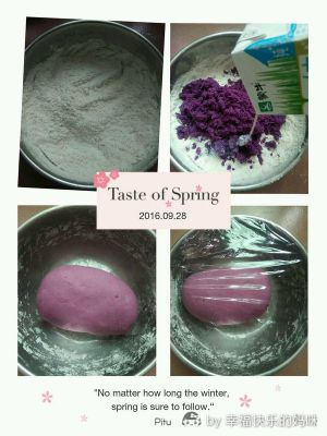 将面粉,白砂糖,孝母粉倒入一个大点的碗搅拌匀,加入紫薯泥再加入牛奶(牛奶量根据需要添加。)搅拌揉成一个面团再用保鲜膜盖静置两个钟让它发酵。