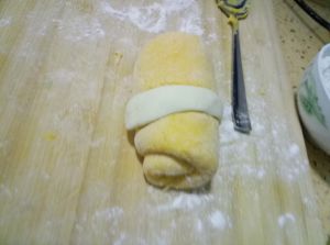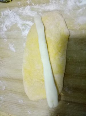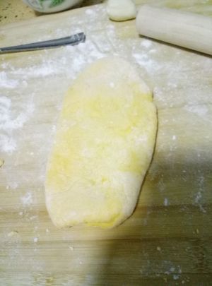 面团用擀面杖擀成长片,刷一点薄油,撒上红枣核桃碎。