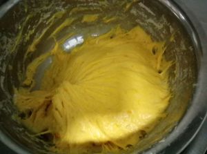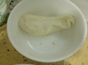 南瓜蒸后,晾凉,捣碎。放入面粉和酵母水,开始和面。图中我做的面比较稀。和好面静置,一小时左右待其发。