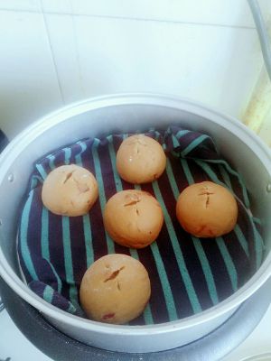 面醒发至面团是原来1.5-2倍时,把各种颜色的面揉到感觉听里面气泡噗的一声的感觉。然后把各种颜色的面都分两部分,小的部分搓成长条,切成若干个小面剂子揉成球,大的那块擀成稍大的面饼,要以能包住面球为依据。颜色上自己组合,但是最好选略微撞色的,看起来漂亮。 包好后,用剪刀十字剪开。 醒发十分钟左右,如果之前面发得不够,就多醒发会,或把蒸屉放在事先加过热的锅上醒发,是关火的状态下哈。 开火蒸十分钟,起锅,摆拍,晾凉了放冰箱冷藏格,早晨用微波炉热一两分钟就可以享受彩色而走营养的早餐啦!