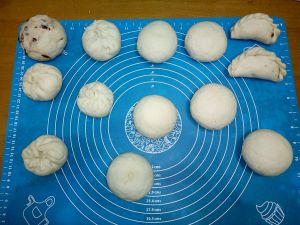 面团发酵至它的两倍大小后,即发酵成功了,再揉面,将面团空气排出,然后把面团揉搓成馒头形状,放置片刻,让它们再次饧发
