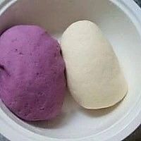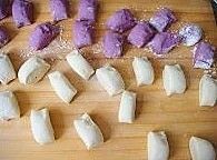 把适量酵母不烫手的温开水化开 紫薯泥加入适量面粉揉成面团,酵母水揉成团。面粉加入适量酵母水也揉成团。