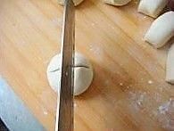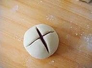 包好后收口朝下,稍微揉圆整理下,用刀在上面横竖十字切两刀
