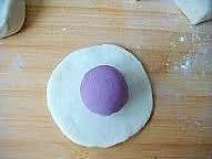 取一份白面团擀成圆形,将紫薯面团揉圆包入其中 ,像包包子一样