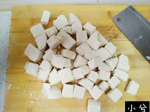 锅内加植物油,温热的时候倒入馒头丁,中火炒至馒头丁微黄,盛出备用