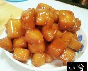 继续搅拌接近这样后, 关火 把炸成金黄馒头块放入锅中