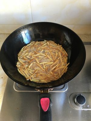 控干水分后炒锅内加入适量花生油,七成热时倒入煮好的土豆条炸至金黄即可。