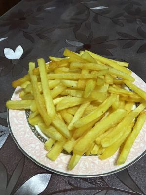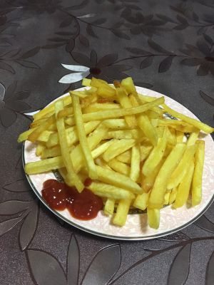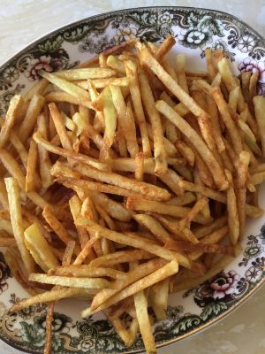 炸好的薯条装盘。可以蘸着番茄酱吃。
