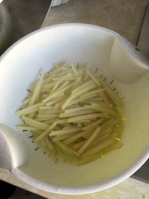 先把土豆切成条 我切的比较细 因为这样熟的会快一点 然后把切好的土豆条焯一下(不用太长时间)焯好之后凉一下