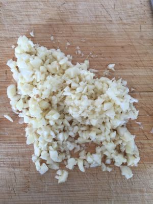 8、油温适度后下切好的蒜末(这步切记油温一定不要太高,否则蒜到锅里就糊了。一定是你刚到油挺个几十秒就行)