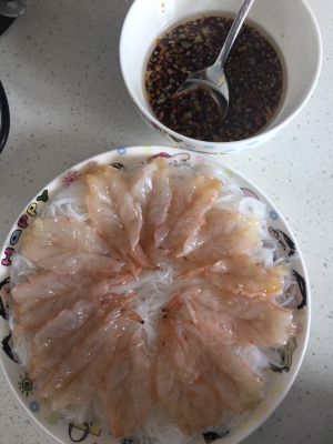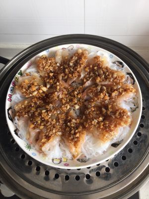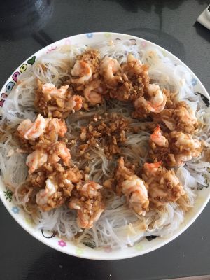 粉丝打底,上面铺一层虾,热油炒蒜,加入生抽,糖。炒熟后铺在虾身上。上锅蒸5分钟。