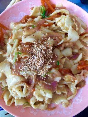 将刀削面倒入翻炒,最后添入辣椒粉、花椒粉、胡椒粉,以及少许生抽,喜欢醋的还可加入少许醋。装盘,撒上点芝麻!