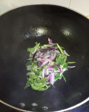 平底锅加入圆白菜、青椒、等爱吃的配料,简单翻炒