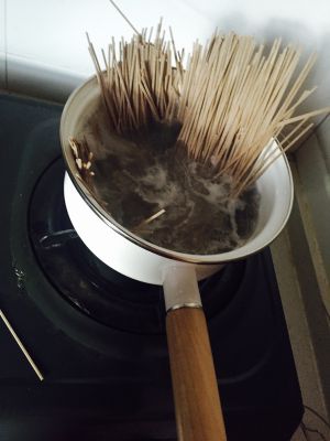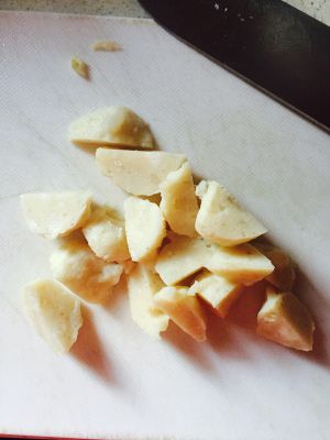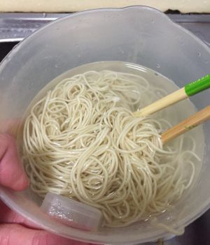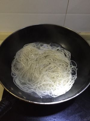 面条捞出,浸泡凉水之中,墨鱼丸煮熟,切块备用