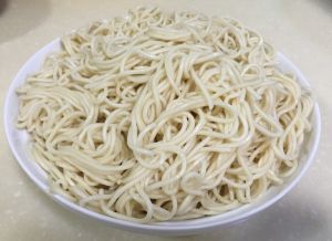 面条煮熟,水沸后加两次凉水,时间不宜太长,不然口感没嚼劲
