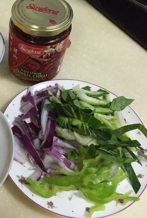准备好各种配料,洋葱,青椒,青菜切丝,虾去头剥皮