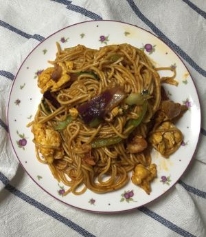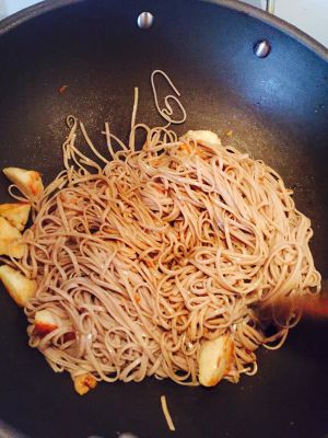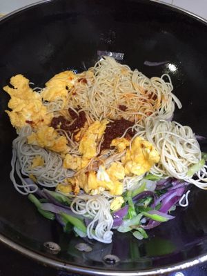 加入沥干水的面条,迅速翻炒,加入调好的调料,翻炒两下,加入鸡蛋,继续翻炒,加入鸡精,少许陈醋,翻炒出锅。整个炒的过程,必须快,否则面条的口感就不好了⁽⁽٩( ´͈ ᗨ `͈ )۶⁾⁾