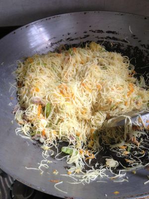 放适量油,炒瘦弱,炒熟放鸡蛋碎,炒均匀。关火,放面用筷子拌均匀。