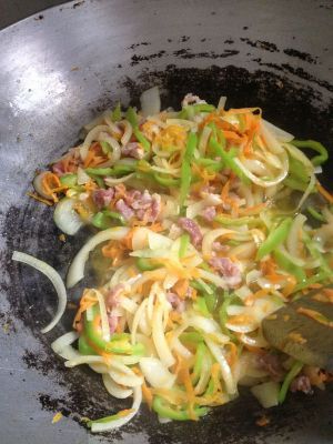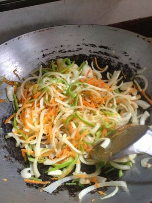 下甜面酱,注入少许高汤,炒匀;大火煮沸,换中火收浓酱汁,;下洋葱丁和青椒丝翻炒几下;下面条,大火翻炒均匀后出锅。
