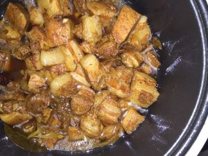 等汤汁收干肉变软烂,加几滴香油,拌匀出锅了