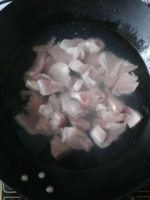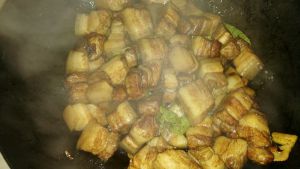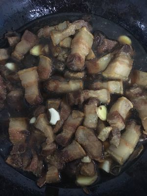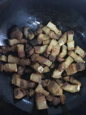 锅里放入少许油,放入白糖炒成微黄色,然后把过水后的五花肉加入翻炒。