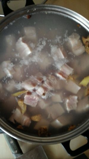 加入五花肉翻遍上色,加入配料,水,大火烧开后,小火炖半个小时!