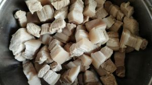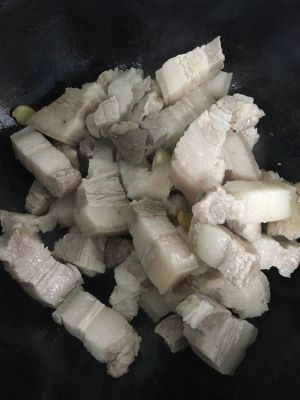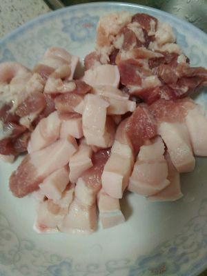 大蒜子20粒、干辣椒切段备用,将压熟的肉切佗,放盐、八角桂皮、料酒、酱油腌制20分钟