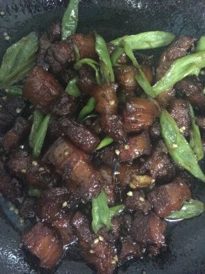 将红烧肉放入大蒜子辣椒中一起翻炒拌匀,岀锅