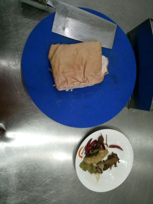 将带皮五花肉去毛,最后选猪肚皮那块的五花肉
