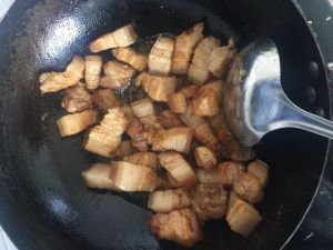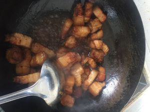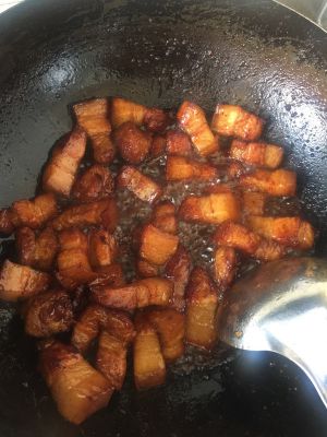 五花肉切方块,热锅凉油放糖炒糖要小火哦见起泡下肉(我做不焯水这样做肉中的油会出去很多)