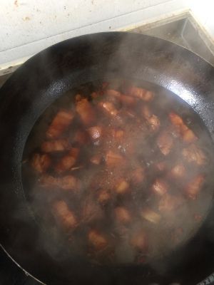 放入香叶花椒大料翻炒见肉变红放入老抽鲜酱油,上色后倒入老汤或水