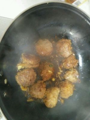 锅内倒入少量油,放入葱姜爆香加水,放入炸好的肉丸,放入适量酱油、盐, 调味调色~ 大火炖开,转小火,炖四十分钟左右。