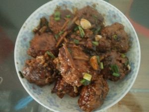 锅内放油,将肉团成小拳头那么大,下锅炸至外表金黄后捞出备用。