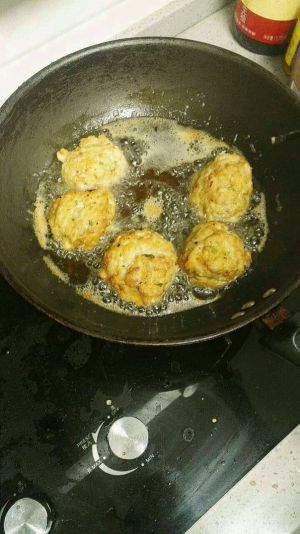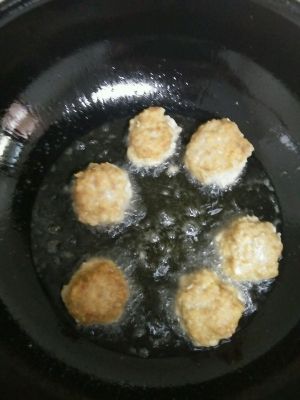 将肉搓成圆形,放入锅中油炸,直到金黄