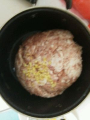 将打碎的肉糜中加入一把姜末 加入一个鸡蛋,和50至80克玉米淀粉, 放到容器中彻底搅拌均匀