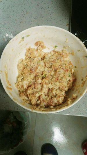 切成石榴米大小,加入上述材料,往一个方向搅拌,使肉上劲。