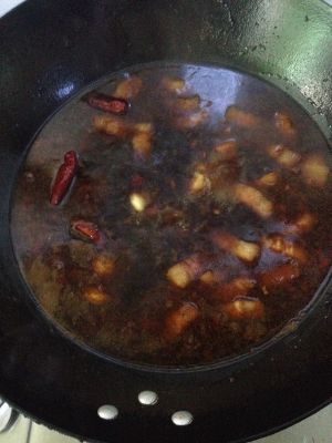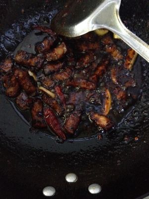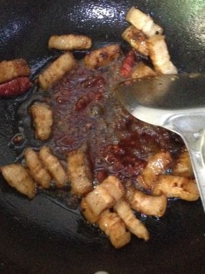 五花肉中间弄个空位,下花椒,干辣椒,豆瓣酱,炸半分钟在翻炒均匀