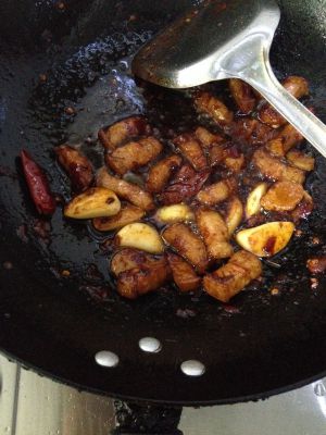 3.再放油开锅,放入冰糖炒香,放入腌好的五花肉,再放入干红辣椒,姜蒜,八角桂皮,盐炒香,放水收汁