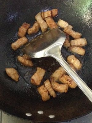 放到锅里干煸,去去油,减少油腻感,(煸出来的猪油留着炒菜或者做猪油拌饭等都很香)