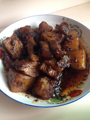 大火收汁,原谅我的红烧肉里看不到肉,一是我的肉比较少,没有我上面写的一斤,二是我给我们家外婆端了一些去楼下。味道是不错的,没有其他八角桂皮之类的调料,所以可以多放一点五香粉,味道也很好。