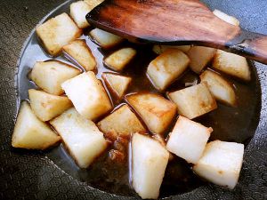 加水煮肉,十分钟后,加入土豆,炖至收汁。起锅