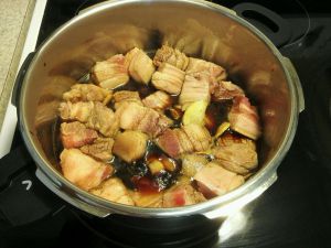 放入五花肉,拌匀,盖盖,煮上汽,中火,高压15到20分钟,时间取决于肉块大小。不要太久,不然肉块容易断开。