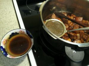 汤匙,一匙米酒,两匙陈醋(提香去腻,可以不放),三匙冰糖,四匙生抽,一匙老抽,少许盐,一碗水,放入高压锅,煮开